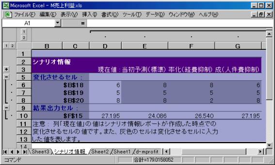 What if 分析を行う場合、前提条件の項目が多いと様々な状況を想定してそれらの結果を比較することが容易ではなくなる。表計算ソフトには、前提条件の組合せを設定し、それぞれのケースで予想される結果を体系的に管理する「シナリオ管理機能」が用意されている。