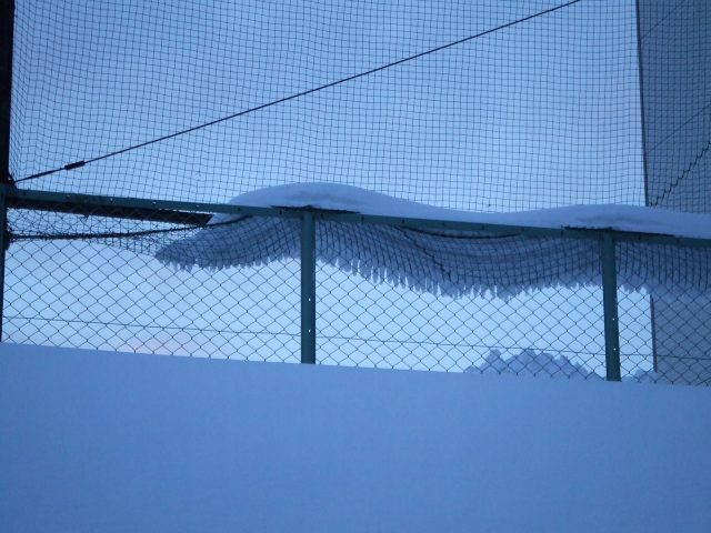 0127雪のいも虫 通用門横のネットを見上げたら,大きな白いいも虫様のようなものが。足のように見えたのは心太のようにネットから雪がはみ出したからでした |