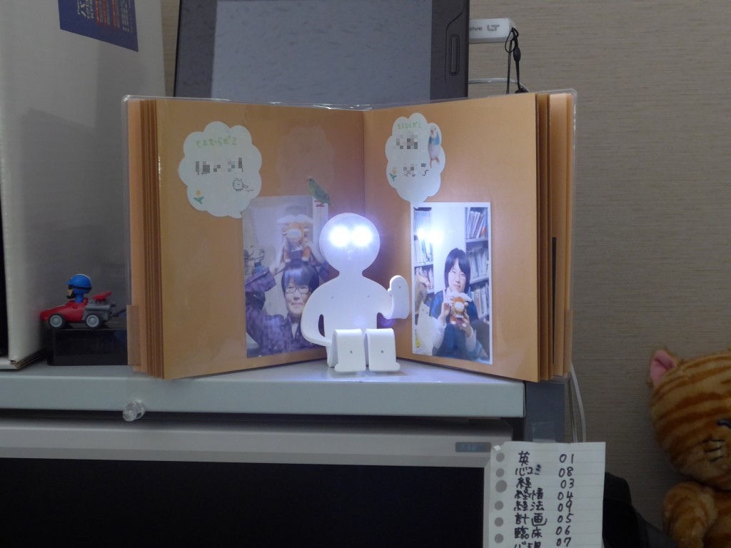修了する二人からアルバムと、真ん中の白い人形(実は携帯スタンドですが、この人形は