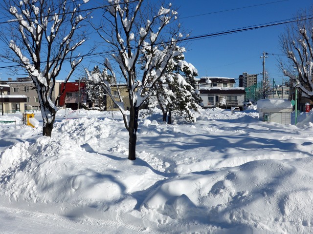 家の前の公園が雪捨て場になっています。どっと降ったせいか、もうすぐ写真左側の黄色い滑り台が埋まるほど積もりました。雪捨ての道もどんどん延びていってます